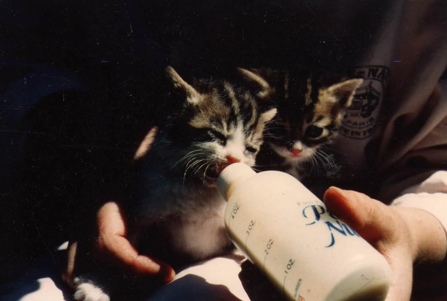 If you are taken by surprise with no pet shop or vet nearby, an eye dropper, or a cotton bud covered with muslin or cotton lawn from which the kitten can suck, will do to give a little improvised liquid food. Evaporated milk diluted with three parts of boiled, cooled water is suitable in emergency; even glucose water (1 teaspoon of glucose powder per cup of boiled water) will serve, but only as the first feed and if the kitten is desperately hungry (however, for a very weak kitten, this is the best mixture to use for the first feed). Cat food manufacturers advise us that the lactose-reduced "cat milk" sold in cartons is NOT SUITABLE for bottle-feeding kittens.The prepared feed should be slightly below blood temperature: a drop placed on the back of the hand should feel neither warm nor cold.The first sips should be given drop by drop to be sure everything is swallowed - you may need to stimulate swallowing by gently stroking the throat after each drop. After the first few drops a kitten will usually get an appetite and start suckling actively, but failing that you should continue with the drop method. It is essential to take things slowly and carefully, as if any food - even the smallest amount - gets into the lungs, infection and death will inevitably follow.As soon as you can, get a proper feeder and teats, and a scientifically formulated milk substitute.